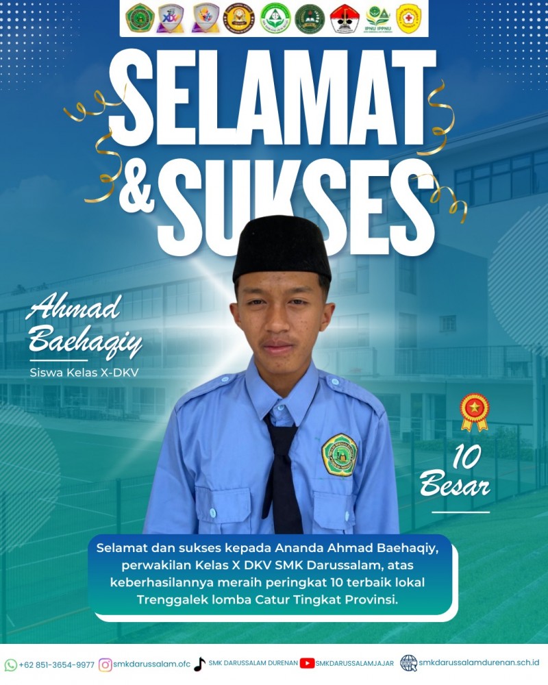 SMK Darussalam Durenan kembali menorehkan prestasi membanggakan melalui salah satu siswanya dalam ajang lomba catur tingkat provinsi. Perwakilan sekolah tersebut adalah Ahmad Baihaqi, siswa kelas X, yang mengikuti kompetisi bergengsi ini pada 4 Januari 2026 di STKIP PGRI Trenggalek.